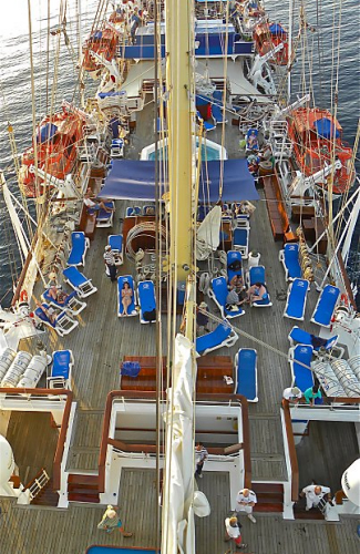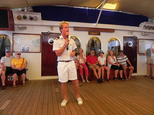 It was actually a bit of a challenge to find a seat in the shade at times. Despite the admonition not to save seats, passengers would put a towel and book on a chair in the shade and then leave. Aargh. One cool thing was that you could walk right up to the navigation cabin. I had a chat with the navigation officer one afternoon and learned that he had been on board for months and was looking forward to going home to his 16-year-old daughter and 11-year-old son.