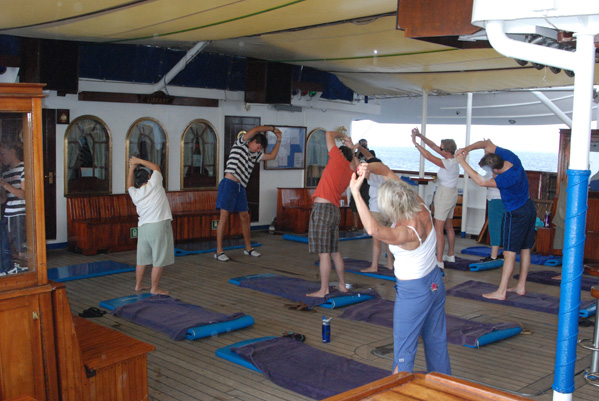 Morning exercise sessions with young Fredrick looked something like this. Push-ups and crunches were a crowd favorite! I was glad to have the stretching and strengthening before the process of getting on and off the ship.